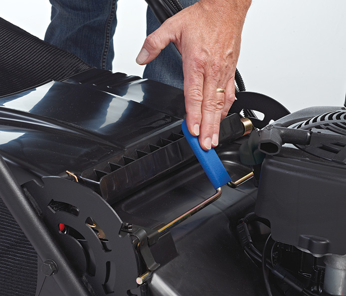 Potete regolare facilmente l'altezza del piatto in 2 punti, senza dovere agire sul tosaerba per regolare 4 diverse leve.