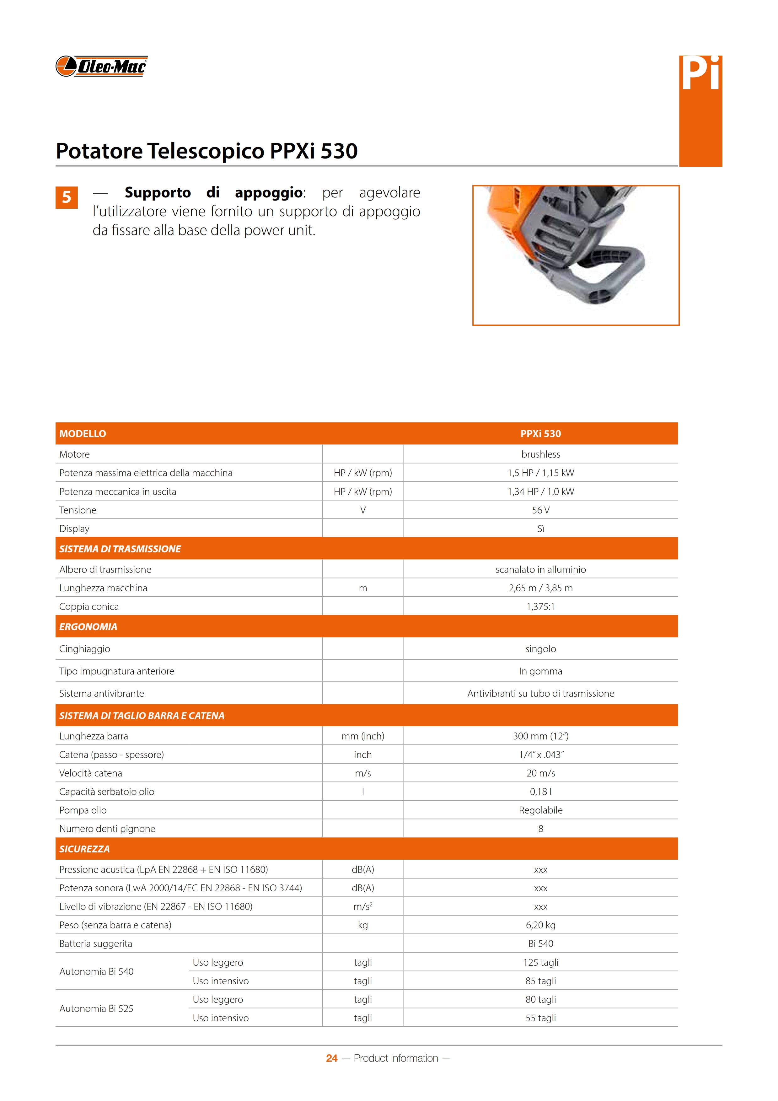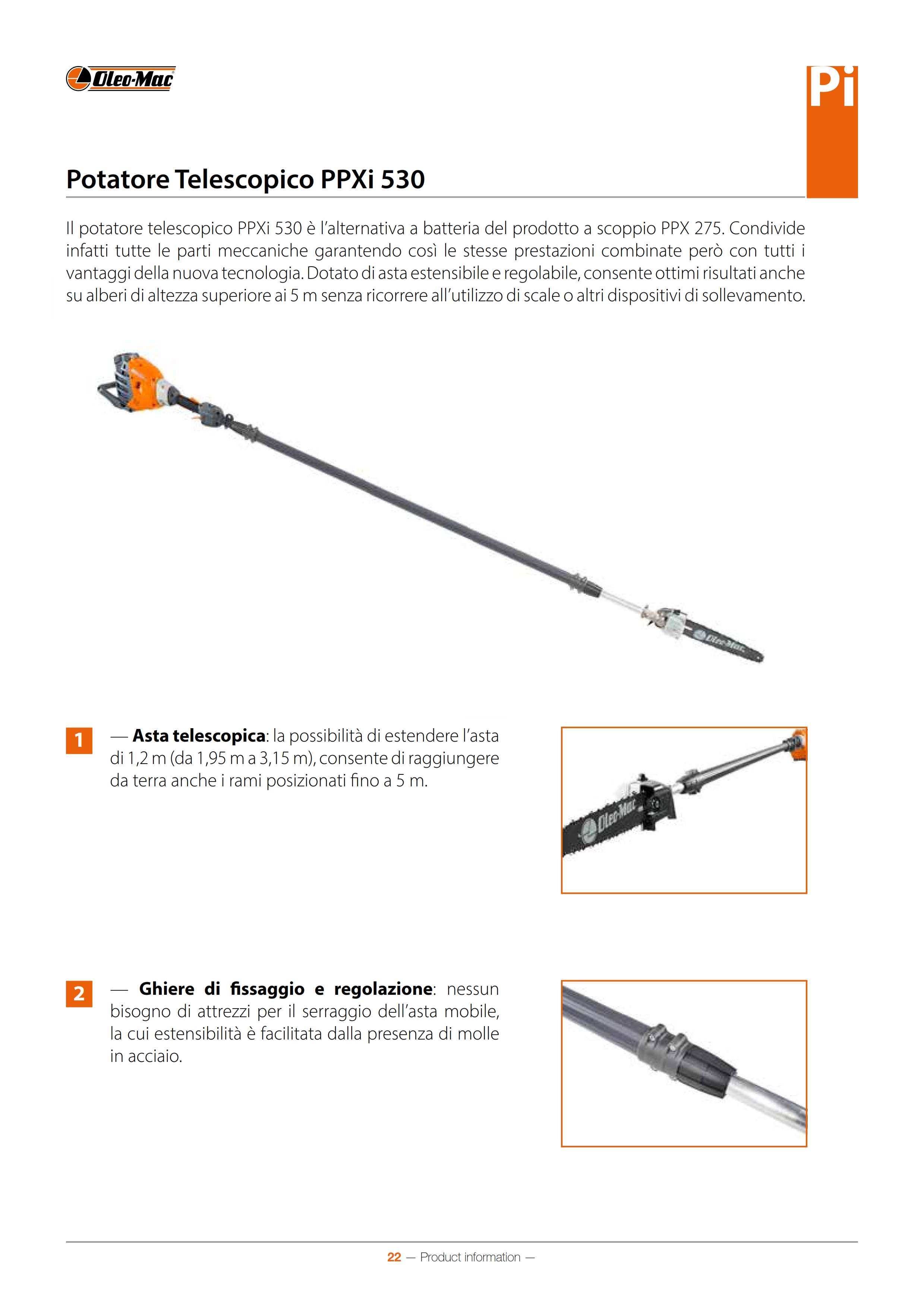 Il potatore telescopico PPXi 530 è l’alternativa a batteria del prodotto a scoppio PPX 275. Condivide infatti tutte le parti meccaniche garantendo così le stesse prestazioni combinate però con tutti i vantaggi della nuova tecnologia. Dotato di asta estensibile e regolabile, consente ottimi risultati anche su alberi di altezza superiore ai 5 m senza ricorrere all’utilizzo di scale o altri dispositivi di sollevamento.