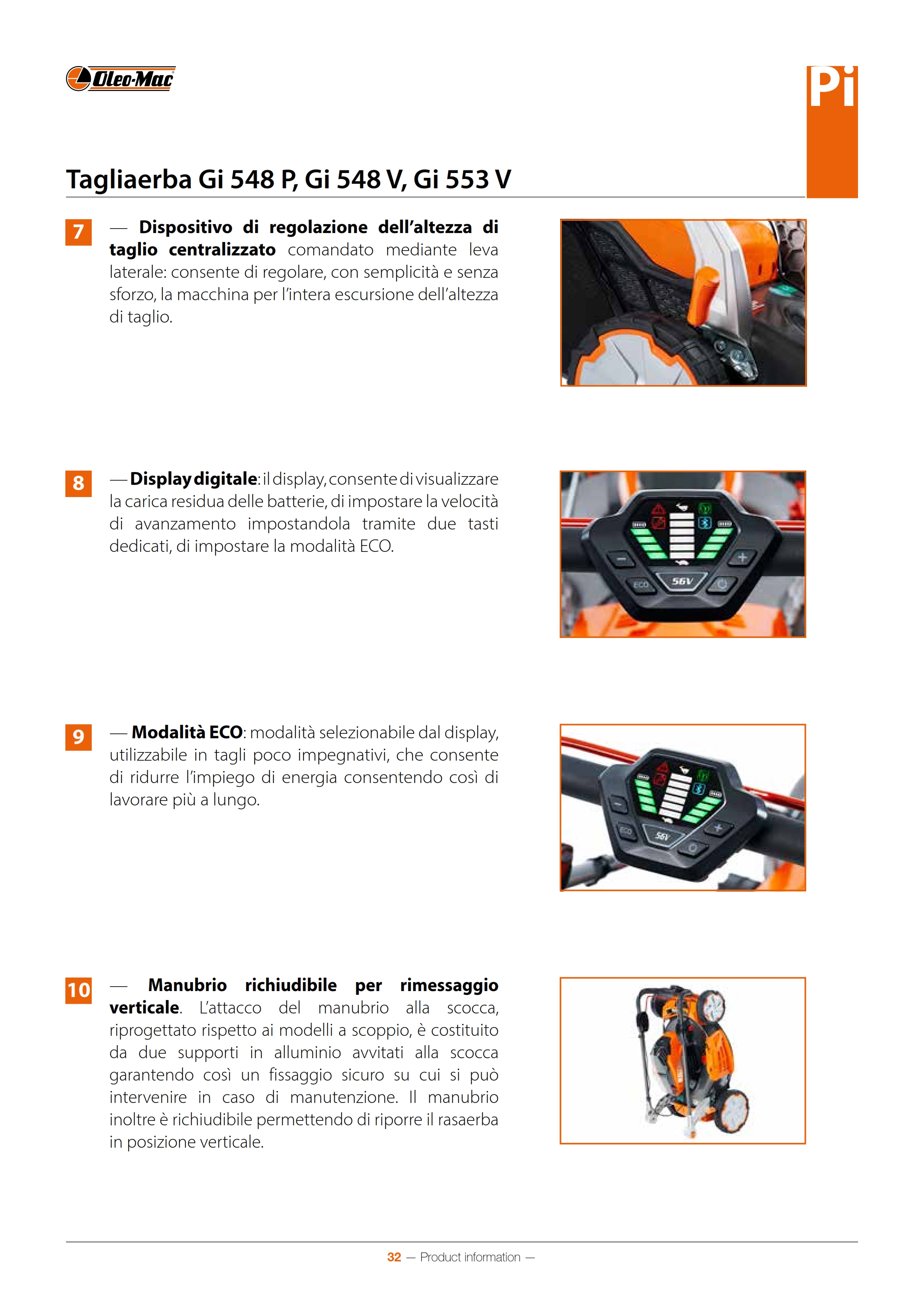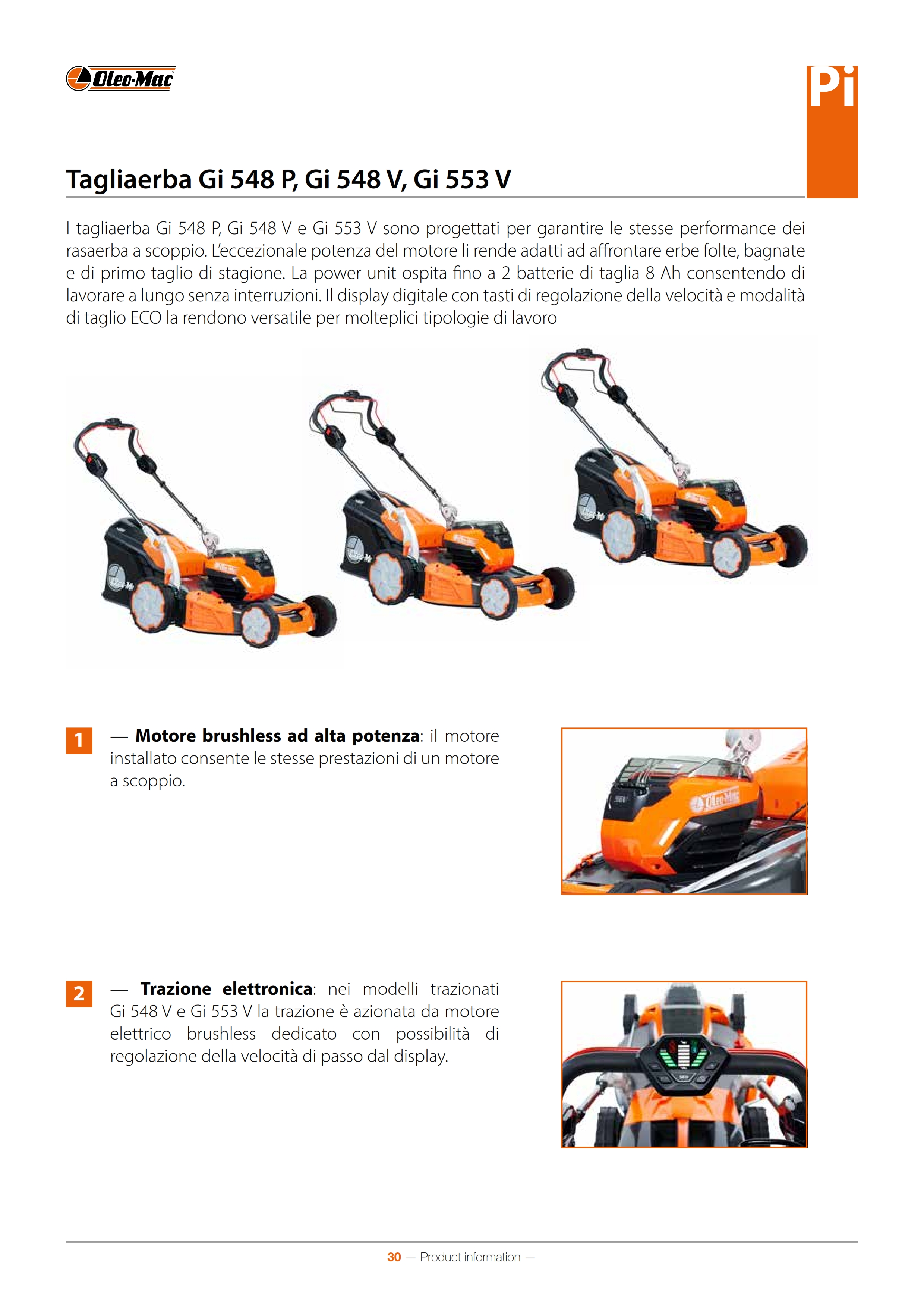 I tagliaerba Gi 548 P, Gi 548 V e Gi 553 V sono progettati per garantire le stesse performance dei rasaerba a scoppio. L’eccezionale potenza del motore li rende adatti ad affrontare erbe folte, bagnate e di primo taglio di stagione. La power unit ospita fino a 2 batterie di taglia 8 Ah consentendo di lavorare a lungo senza interruzioni. Il display digitale con tasti di regolazione della velocità e modalità di taglio ECO la rendono versatile per molteplici tipologie di lavoro