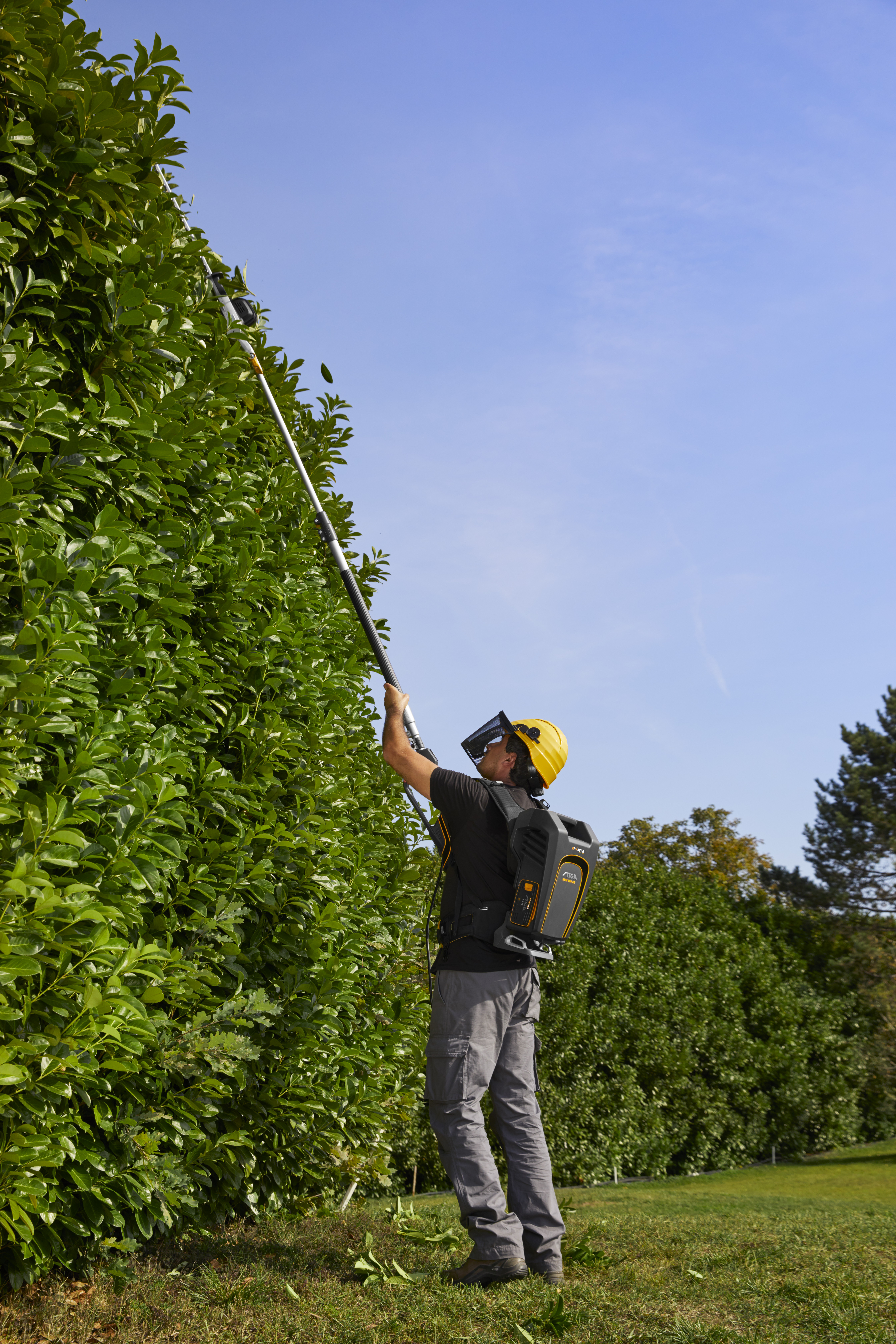 Potente, preciso e leggero (soltanto 4,9 kg di peso), il braccio tagliasiepi SPH 900 AE consente di ottenere risultati senza precedenti nel dare forma alle siepi e agli alberi. Il suo innovativo motore senza spazzole da 400 W abbinato alle due batterie da 48 V e 7,5 Ah, alloggiate nello zaino portabatteria, garantiscono oltre 200 minuti di potenza ininterrotta. L'asta telescopia è estendibile fino a 4 m mentre le tre velocità e le sei posizioni di taglio assicurano un controllo ottimale, in qualunque occasione.